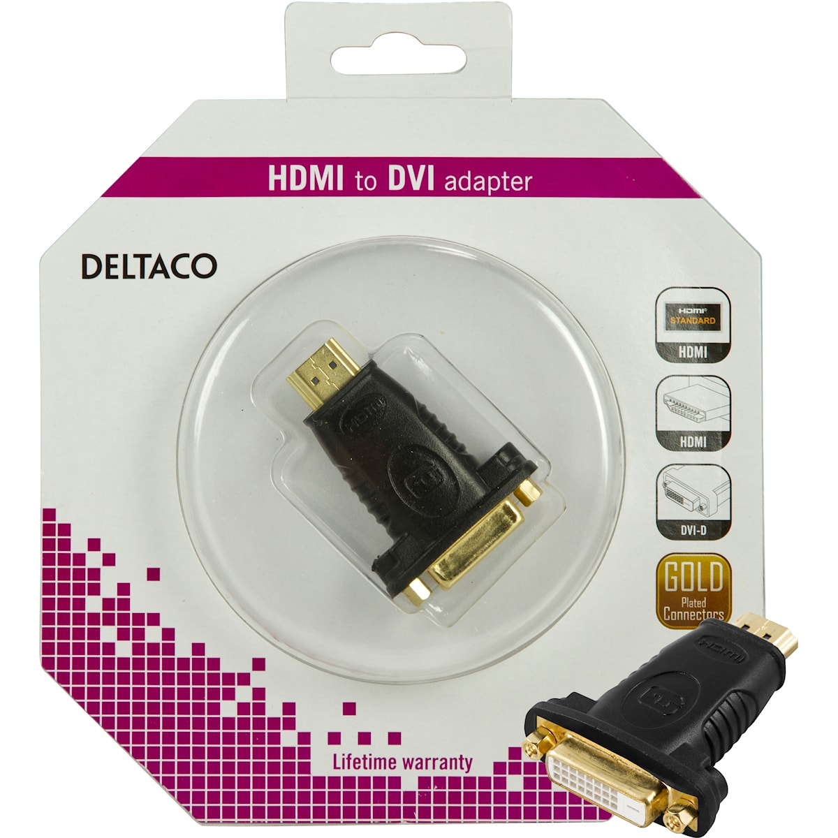 HDMI-adapter med guldpläterade kontakter HDMI 19-pins hane till DVI-D hona. Adaptern kan användas för att koppla ihop en DVI-kabel från en projektor eller bildskärm till en enhet med HDMI-utgång, typ DVD, Bluray-spelare, tvspel etc.