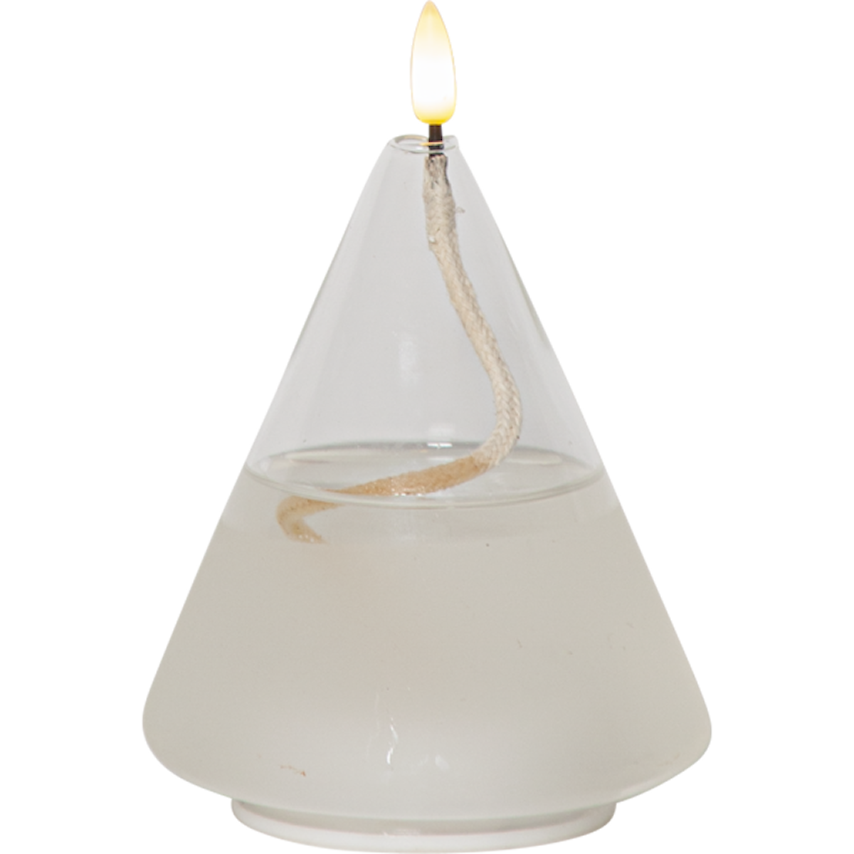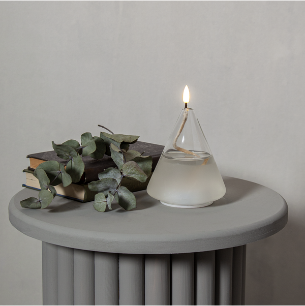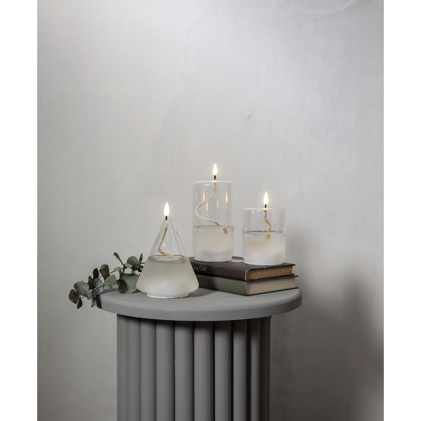 Flamme Float är en elegant LED-lykta från Star Trading med en innovativ design som efterliknar ett autentiskt oljeljus. Den transparenta glasbehållaren är fylld med genomskinligt vax där en LED-veke ser ut att flyta, vilket skapar en förtrollande illusion. Naturliga luftbubblor i vaxet förstärker det naturtrogna intrycket och ger varje lykta ett unikt utseende.
